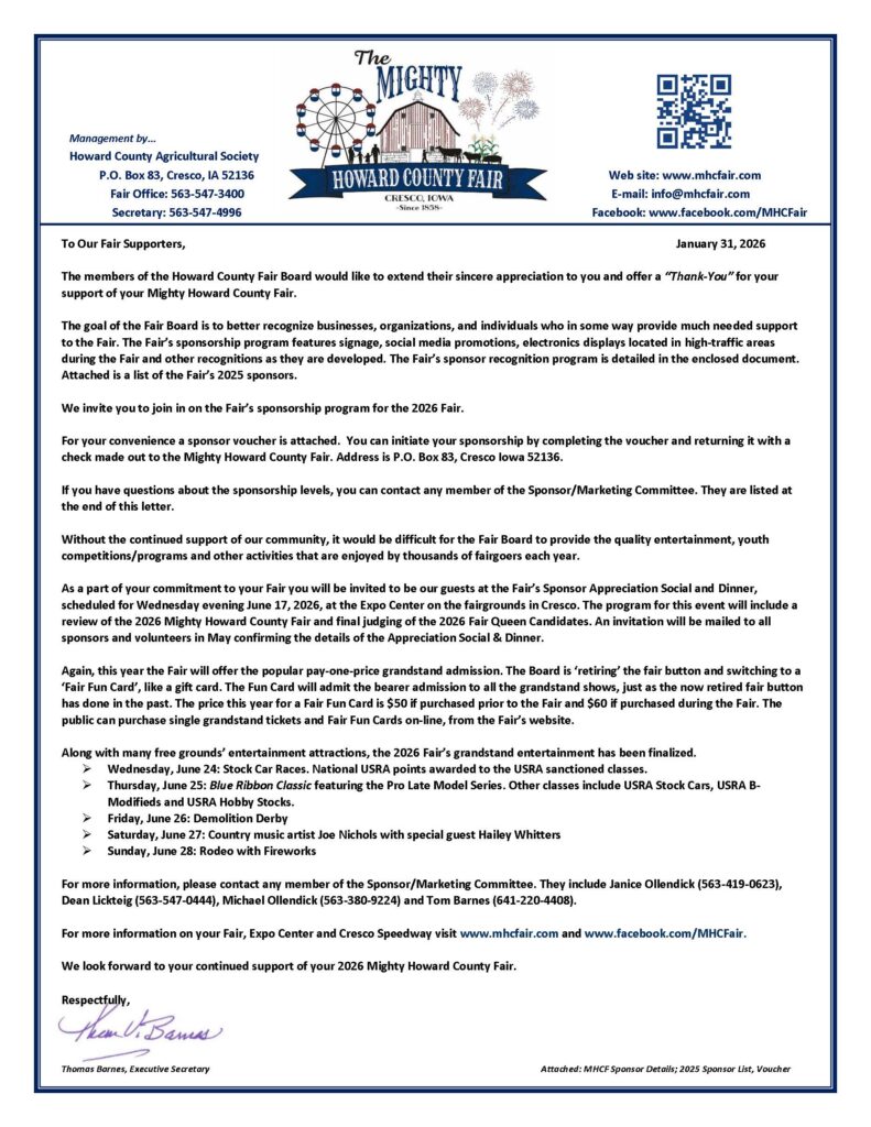 (For more information, please contact any member of the Sponsor/Marketing Committee. They include Janice Ollendick (563-419-0623), Dean Lickteig (563-547-0444), Michael Ollendick (563-380-9224) and Tom Barnes (641-220-4408). )
