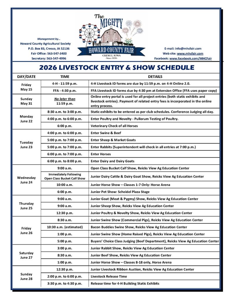 Each year, one of the most anticipated and important parts of the fair is the 4-H & FFA Exhibition. Download the guide below for all rules, regulations, and show times for all 4H & FFA exhibitors.